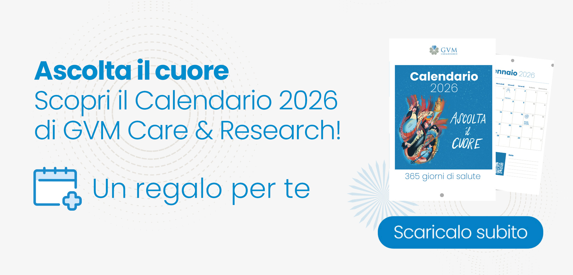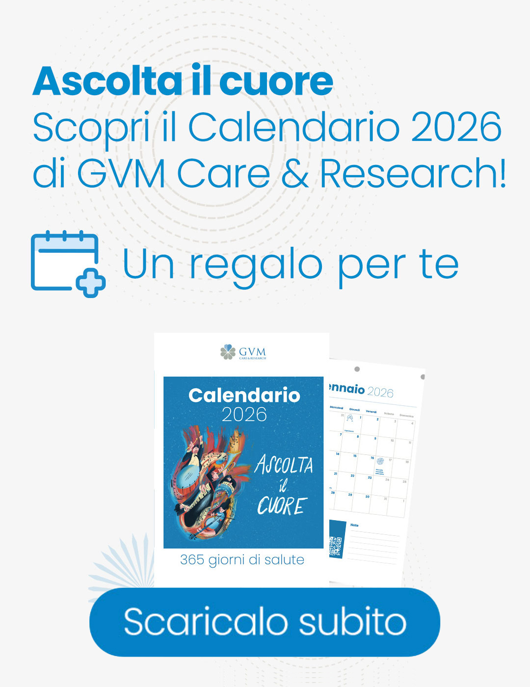Per il 2026, GVM Care & Research ti accompagna in un viaggio unico di consapevolezza e benessere. Il calendario 2026 è la tua ispirazione quotidiana per prenderti cura del tuo cuore, un’opera che trasforma il battito cardiaco in arte.